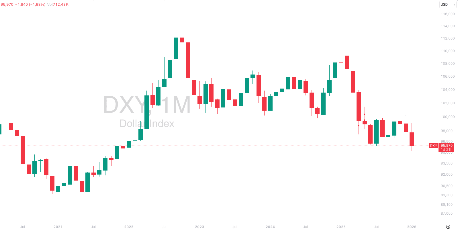 [GRÁFICO 1: Índice DXY (dólar global) – timeframe mensal, mostrando queda desde 2022]