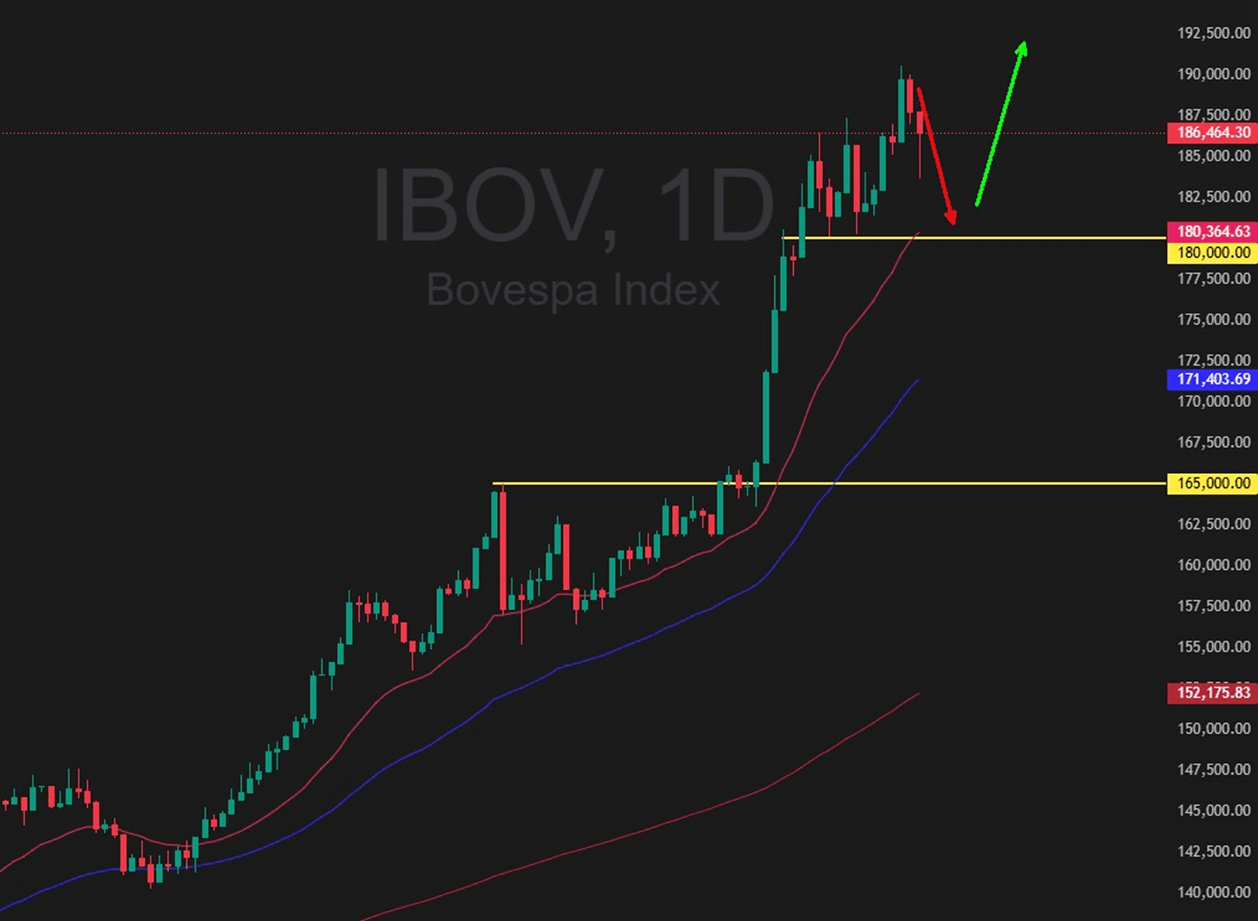 O Ibovespa renovou máxima histórica na região dos 190 mil pontos e apresentou correção pontual. A tendência principal permanece fortemente altista. Tecnicamente, uma correção saudável até a região dos 180 mil pontos, em confluência com a média móvel de 21 períodos no gráfico diário, não descaracteriza a tendência e pode preparar o ativo para um novo movimento de pullback e continuidade.